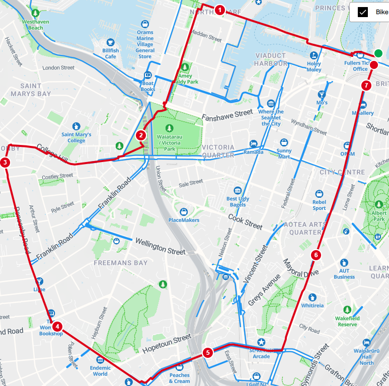 Start and finish at the Queens Wharf Bike Hub, opposite the Ferry Terminal.