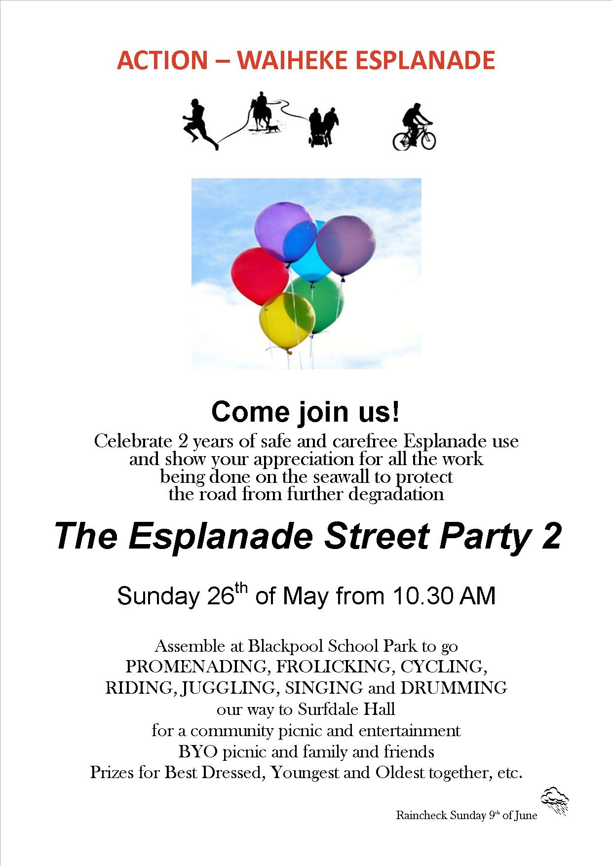 Today’s rain is forecast to move on by tomorrow , which improves the prospect of getting out on bikes. This could include a trip to Waiheke where cyclists and walkers are inviting us to join their celebration marking 2 years of car-free use of The Esplanade. It’s the short road around the headland between Blackpool and Surfdale (for those who struggle with the intriguing geography of Waiheke; it’s ‘over the back, and down the hill’ from Oneroa, the charming village of quirky shops you pass through after arriving on the island).