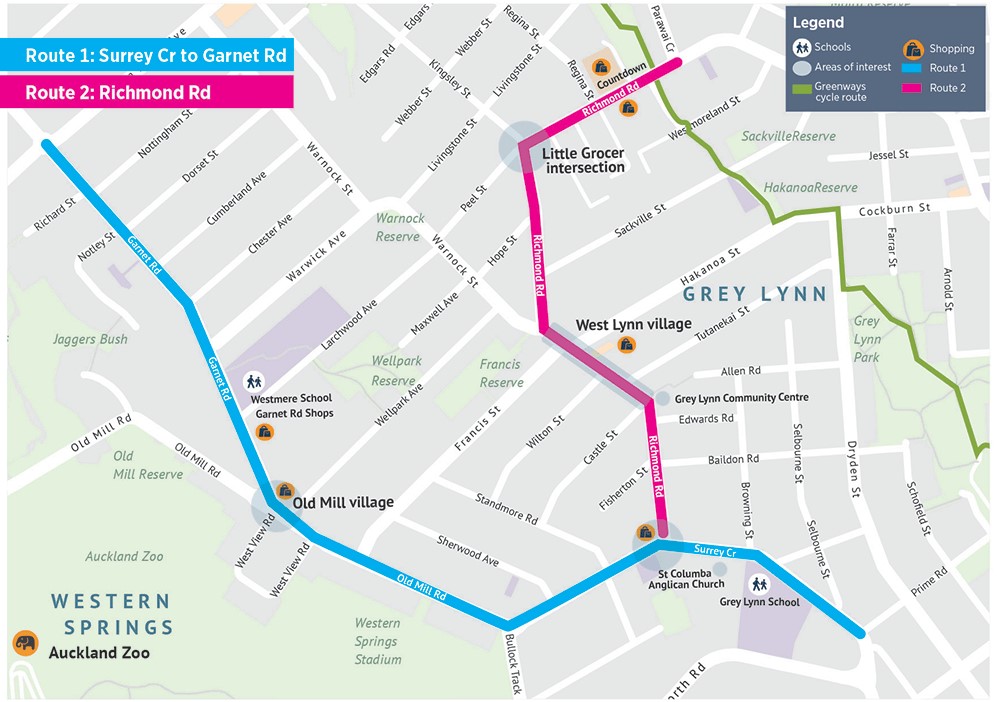 If you were doing this, you’d also make sure there’s a safe continuous route along Great North Road into Pt Chev, including up Motions Road to Western Springs College and the Zoo.