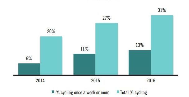 The headline figure is that 31% of people surveyed had cycled, up from 27%. The researchers say this represents an increase of 45,600 people.