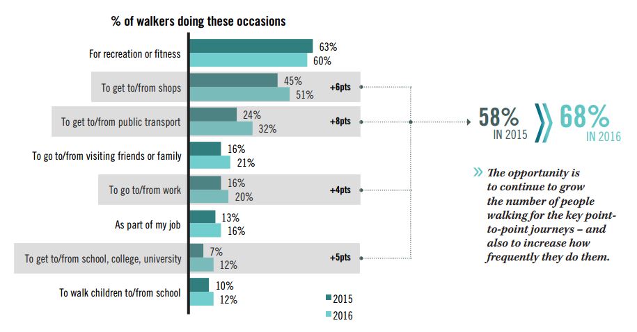There was a big jump in the number of people walking for non-recreational journeys, up 17 percent from 2015.