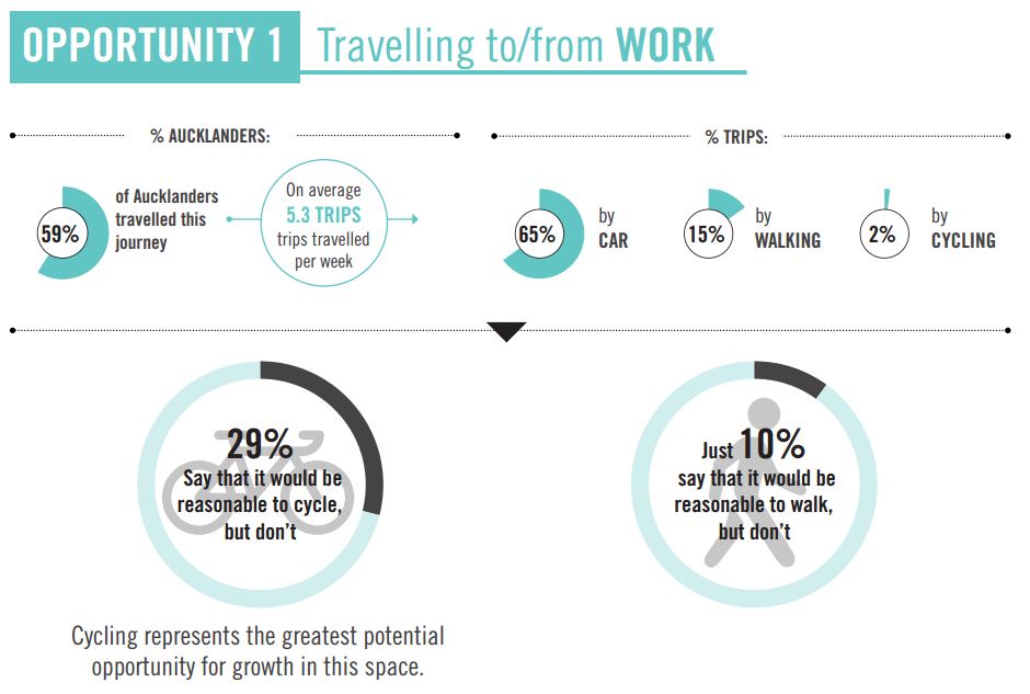 The report also looks at the opportunities for growing the use of active modes for trips. First up for work where cycling is thought to be the biggest opportunity.
