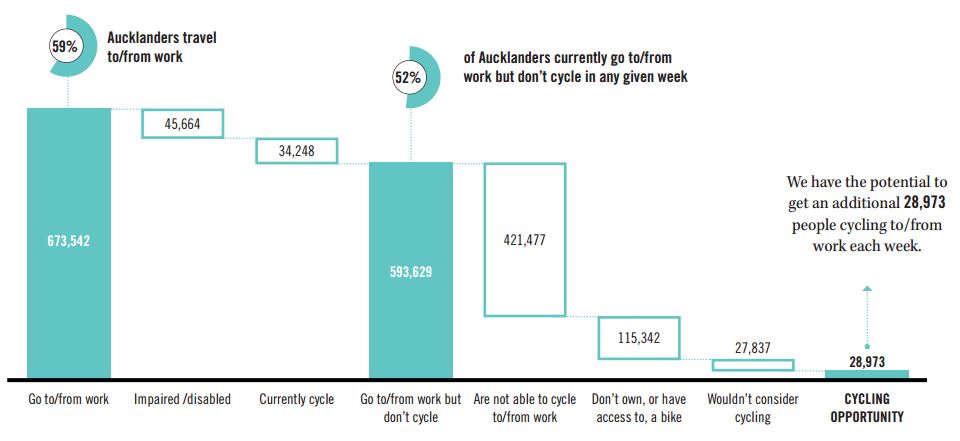 They break down the cycling to work opportunity as below. I can’t understand why they don’t also count the ‘Don’t own, or have access to a bike’ in the opportunity’. Within the last year I’ve personally heard of a number of stories of people buying bikes to take advantage of some of our fantastic new infrastructure such as Lightpath. It also highlights to me why we need to be looking seriously at options like bikeshare schemes, particularly as our cycling network expands and improves.