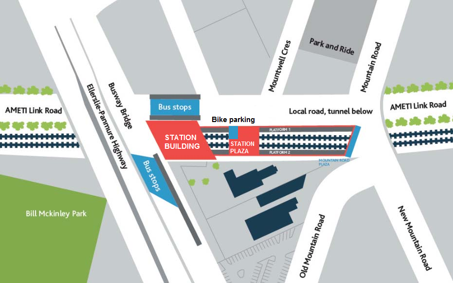 The plan below shows both the station building and the smaller plaza opposite coloured red. (Click to make clearer.) The bike park is shown as a blue square on the plaza. This site has good views down to the train lines, is covered by CCTV and the supervised by the 24 hour security personnel based at the station. After considering a range of locations we support this as the most practical option available.