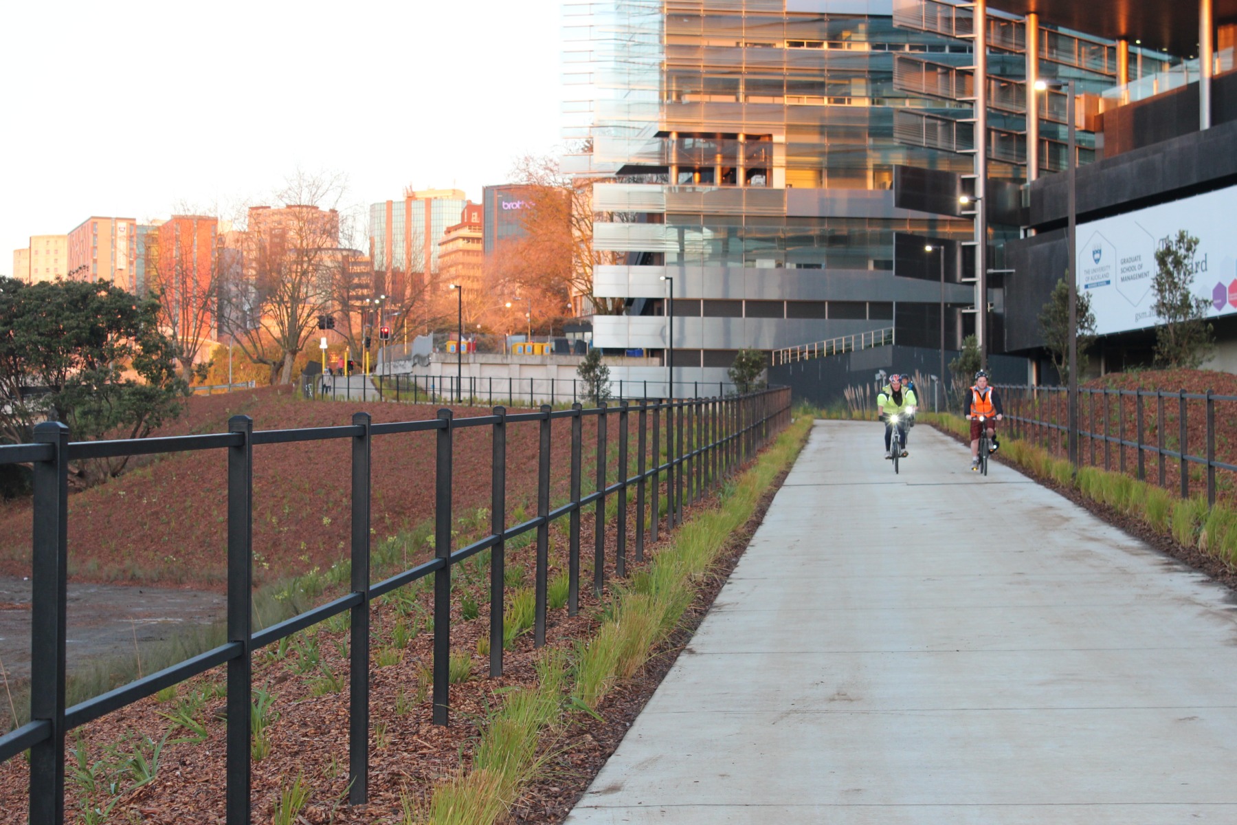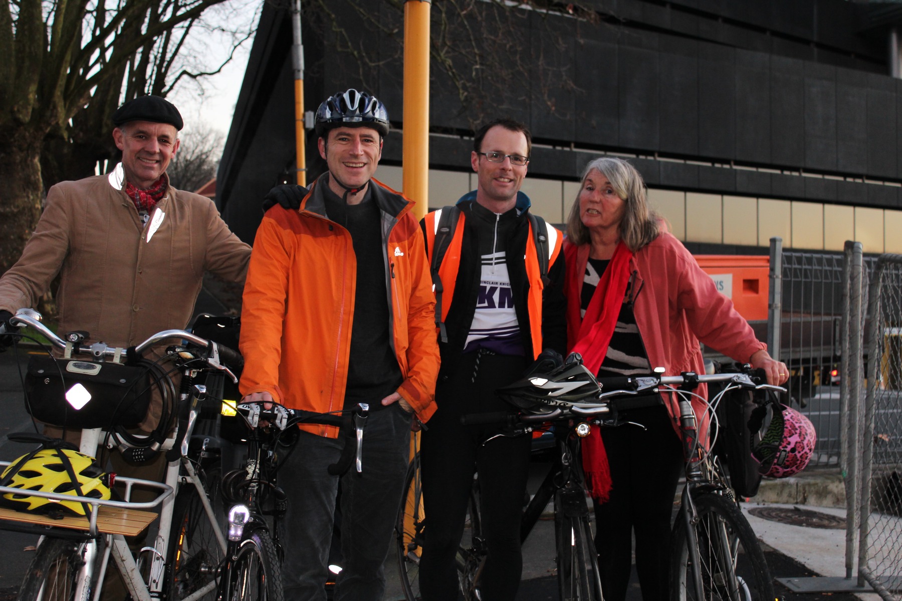 For the icy temperatures, we had a great turnout of cyclists at this morning’s opening of the first stage of the Grafton Gully Cycleway, between Grafton Road and Alten Road. Myself and two of CAA’s Associates claimed confusion over which end the event would start as our excuse for actually riding the section uphill – before the official opening. Then a whole crowd of us rode back down, to warm coffee, happy smiles and a wonderfully wide cycleway. Wide cycleways are wide!