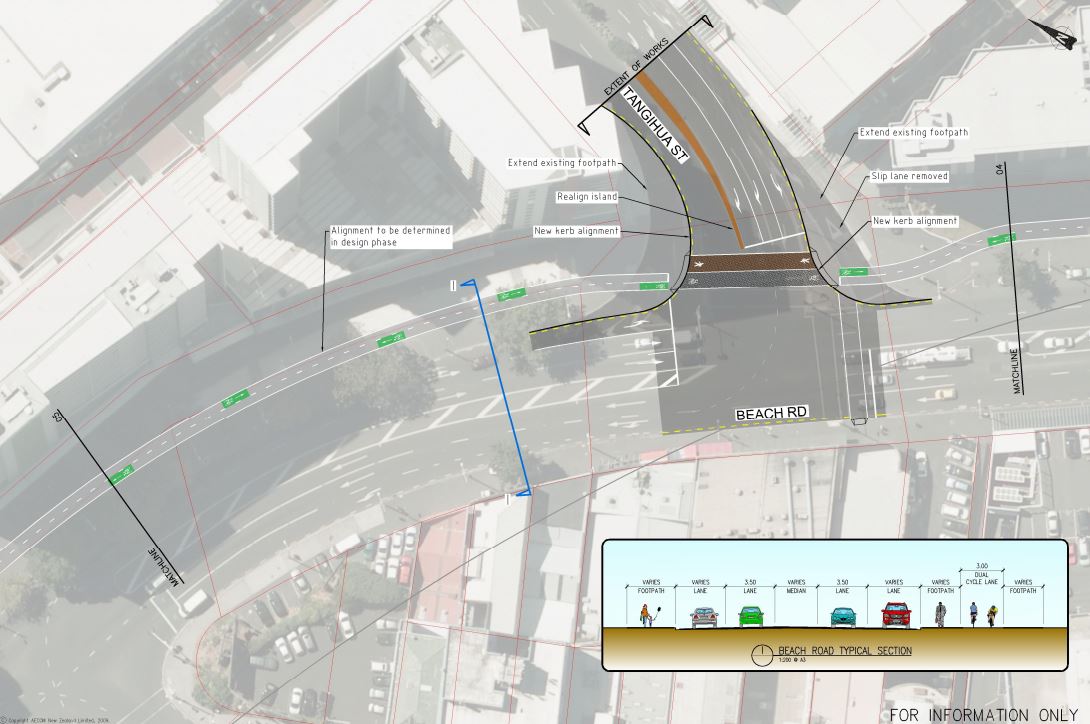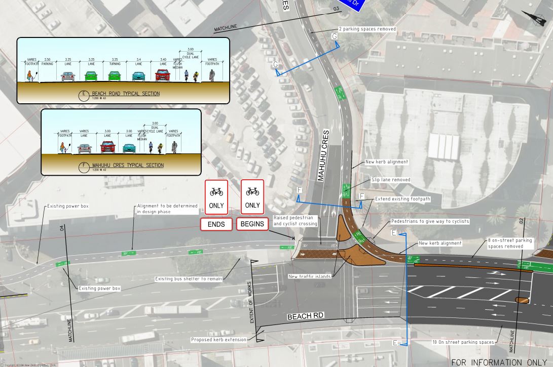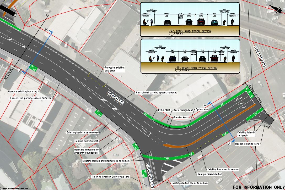 - Section 01 – South End: Linking into the Grafton Gully Cycleway on Churchill (still to be built), and also providing cycle lanes to/from the Stanley Street / Beach Road intersection.