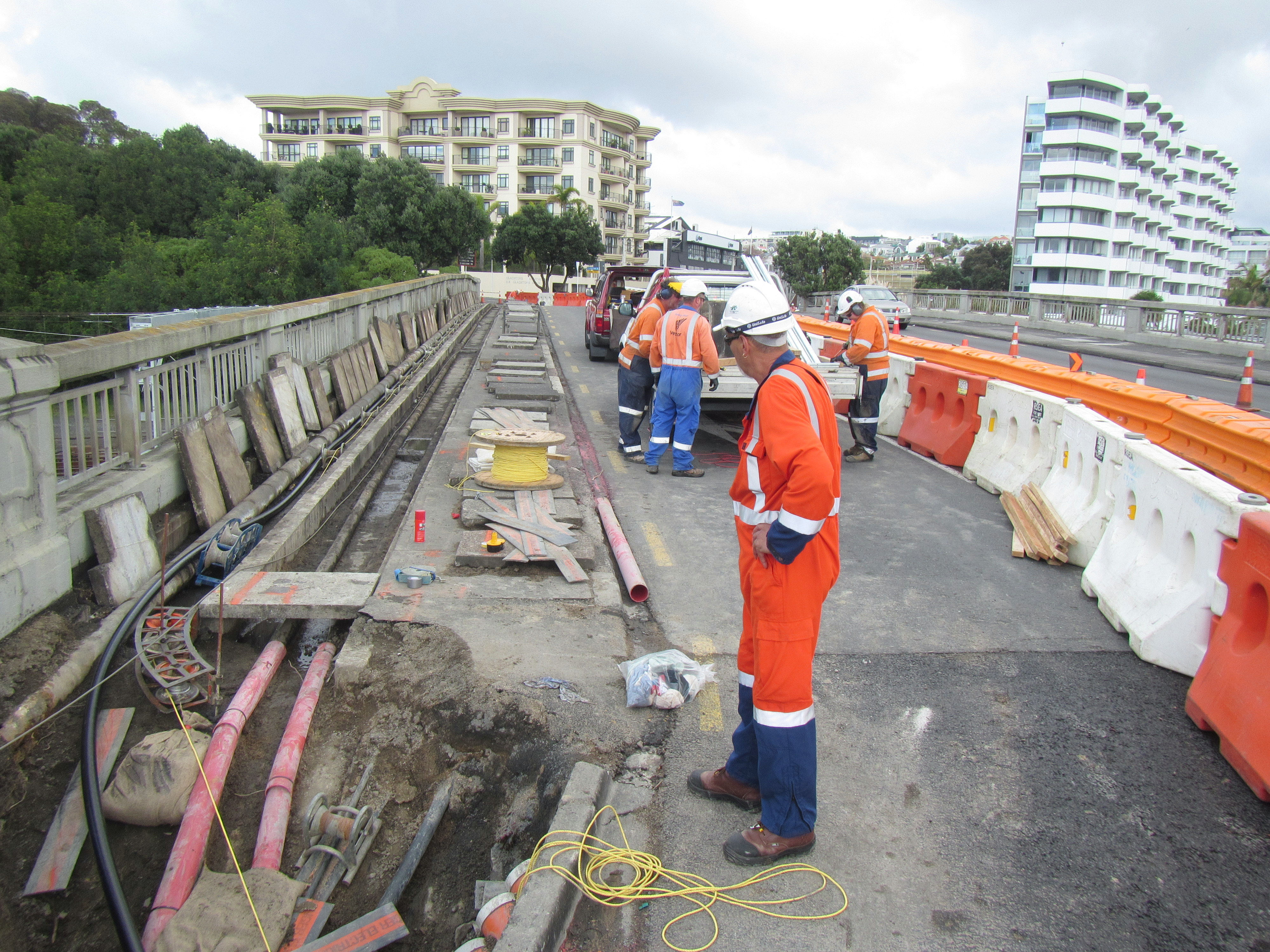 I must confess, I was tricked for a moment a couple of Saturdays ago when I was returning by bike from the La Cigale Farmers market, and ran into a huge line of trucks and trailers and cars . I thought the delay signaled work was happening on our project – but no – it was a Vector contractor digging into the rail overbridge.