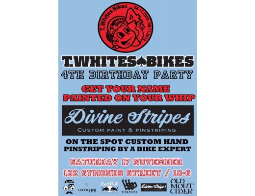 In an amazing feat of badassness- T. White’s Bikes comes to celebrate it’s FOURTH BIRTHDAY on Saturday the 17th of November.