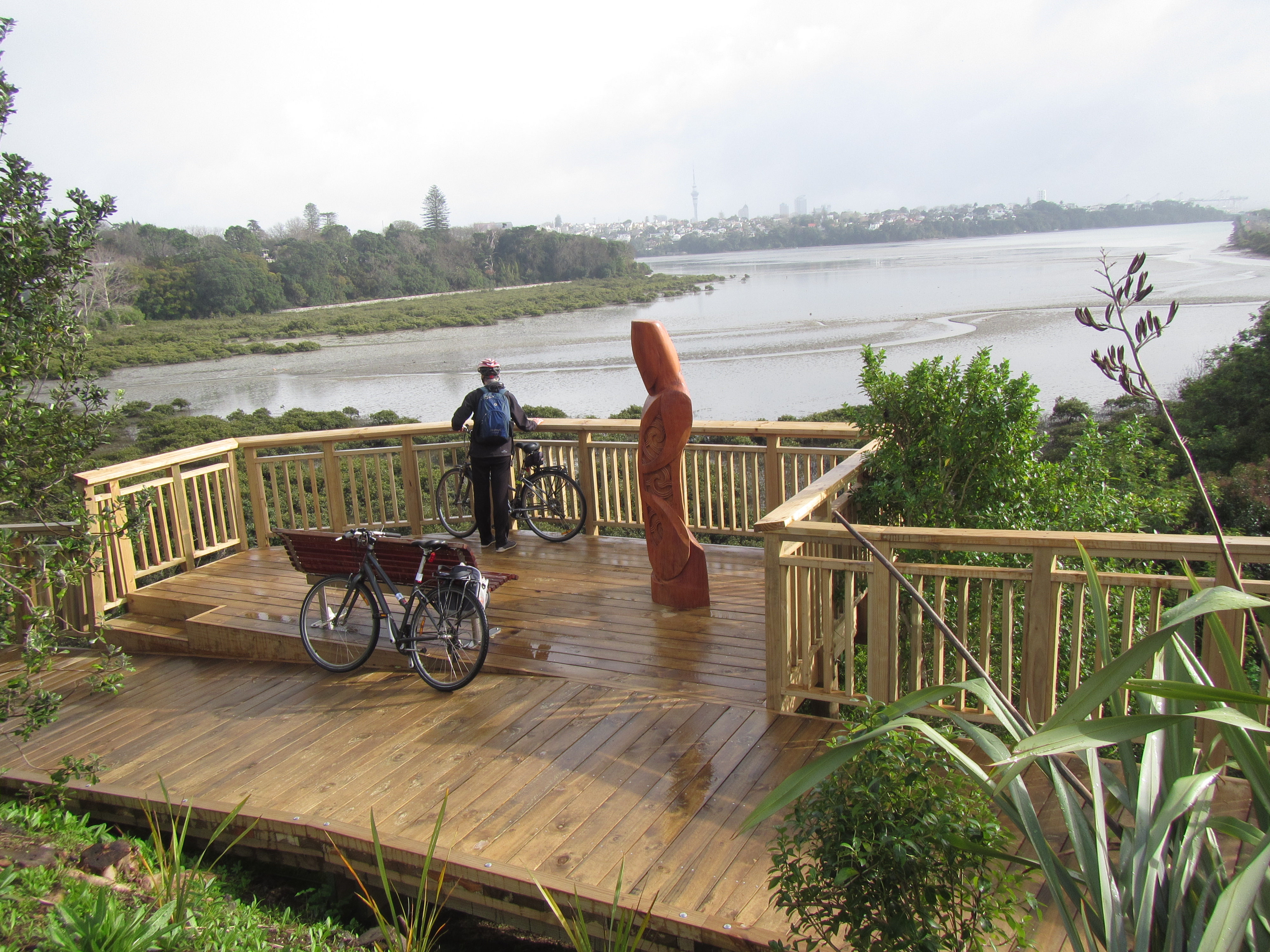 We then crossed Orakei Rd to find the newly completed boardwalk that heads towards Shore Rd, overlooking Hobson Bay. It’s great – go see! We were impressed by the wooden sculpture celebrating local iwi. If you look carefully you’ll spot the existing Hobson Bay boardwalk in the mangroves below St Kentigerns College.