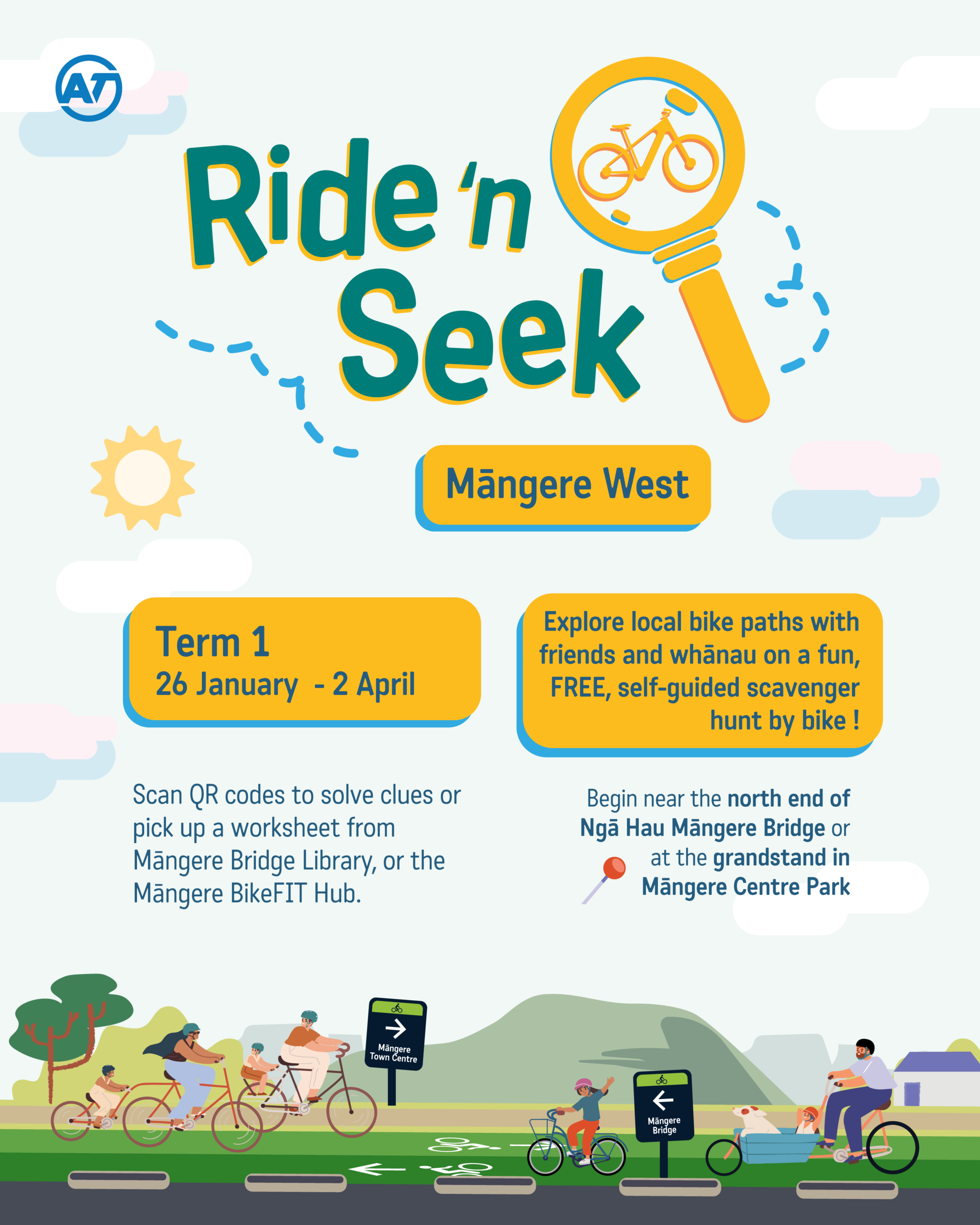 Ride ‘n Seek Māngere West Thursday March 12 @ 8:00 am - Sunday April 19 @ 11:30 pm Ngā Hau Māngere Bridge (northern/ Onehunga side) Discover Māngere by bike in a family scavenger hunt! Solve clues, explore paths, and earn entries to win prizes. Free